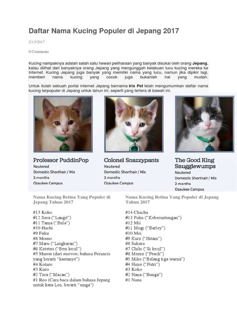 Fenomena yang sama berlaku di Jepun. Sebelum kita pergi jauh ni kitorang nak tekankan semua kucing Ye SEMUA kucing sebenarnya comel. Cukup beralasan juga bahwa Jepang memiliki kumpulan nama kucing yang banyak digemari untuk dipilih dan perusahaan asuransi hewan peliharaan Anikomu baru-baru ini melakukan jajak pendapat untuk mengetahui mana nama yang.